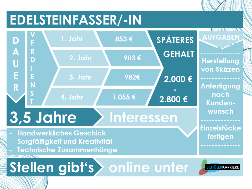 Nach 3.5 Jahren in dieser Ausbildung darfst Du Dich stolz Edelsteinfasser nennen. Währenddessen genießt Du eine überdurchschnittliche Vergütung, mit der sich sicher die erste eigene Wohnung finanzieren lässt. Nachdem Du im ersten Jahr mit monatlich 853 Euro rechnen kannst, erhöht sich dein Verdienst bereits im zweiten Jahr auf 903 Euro. Im Jahr darauf sind es schon 982 Euro, bis du im letzten Ausbildungsjahr sogar 1.055 Euro verdienst. Dein Gehalt im Beruf wird je nach Erfahrung zwischen 2.000 und 2.800 Euro pro Monat liegen.