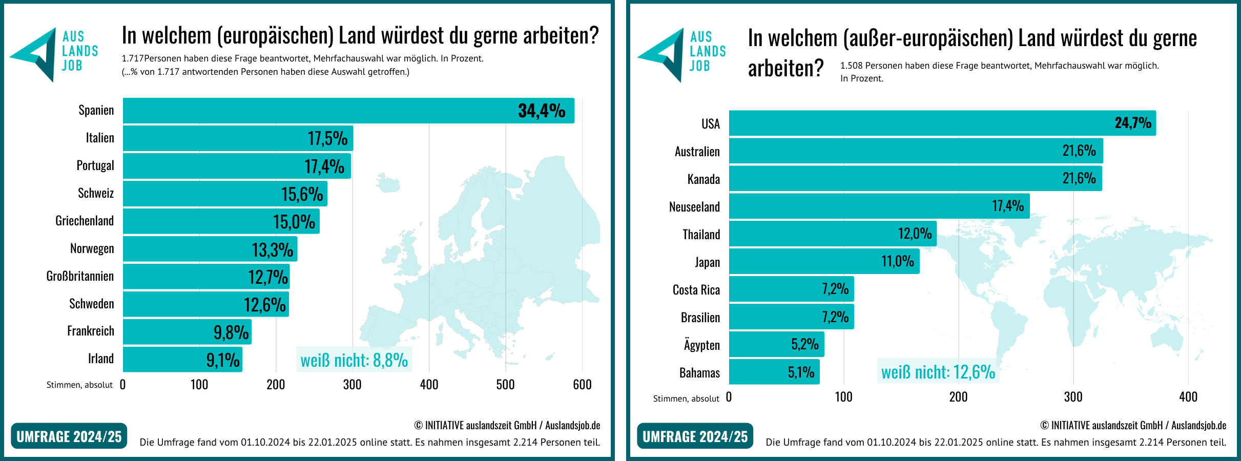 In der Studie von Auslandsjob.de wurden mehrere tausend Personen befragt, die darüber nachdenken, im Ausland zu arbeiten oder Remote Jobs mit internationalem Bezug zu nutzen.