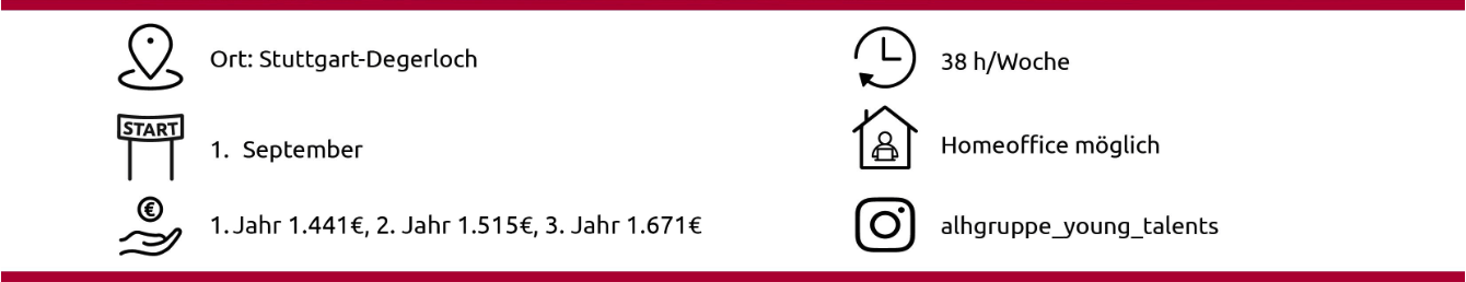 Du lernst in der perfekten Kombination aus praktischen Erfahrungen und theoretischen Inhalten (3-Monats-Wechsel zwischen Theorie und Praxis). Wir bieten ein praxisnahes Studium in Kooperation mit der Dualen Hochschule Baden-Württemberg (DHBW). Das theoretische Wissen wird dir in den Theoriephasen an der DHBW Stuttgart sowie in unseren praxisnahen Seminaren vermittelt. Wir legen sehr viel Wert auf deine persönliche und fachliche Entwicklung und bieten regelmäßige Entwicklungsgespräche sowie Unterstützung durch erfahrene Fachausbilderinnen und Fachausbilder an deiner Seite.